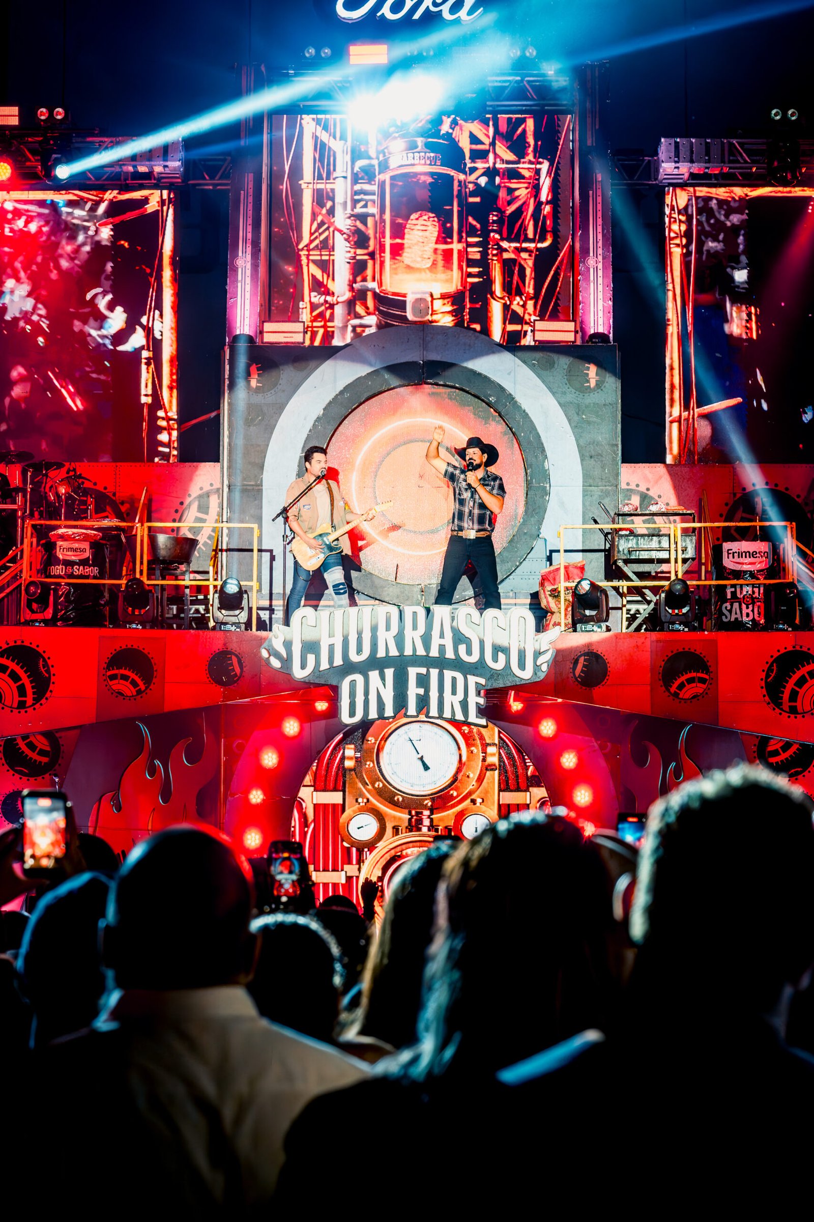 O Churrasco On Fire tem o maior palco itinerante da América Latina, composto por 12 espaços distintos distribuídos estrategicamente. Não há palco principal fixo. A proposta é criar proximidade e mobilidade, permitindo que a apresentação aconteça em diferentes pontos do espaço. O show tem início a mais de 10 metros de altura e se desenvolve em uma estrutura móvel, com ativações e conexões entre palcos ao longo das três horas de apresentação.
