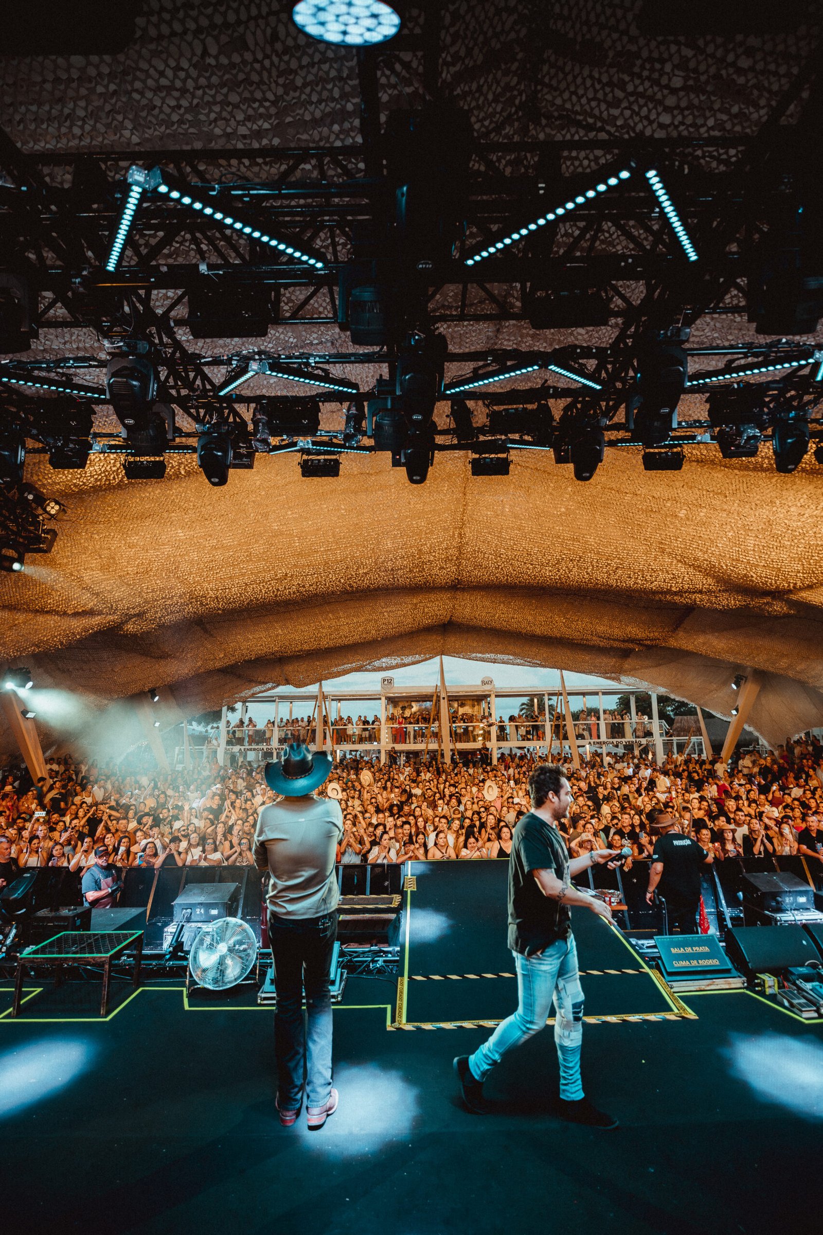 Se há um coração pulsante neste evento, ele bate dentro da Máquina do Churrasco, uma carreta gourmet com 40 m² de área fechada e 350 m² de área aberta, criada exclusivamente para o projeto por Fernando e Sorocaba em parceria com Camaleão Cenografia e Artmill. No primeiro andar, os parrilleros trabalham os cortes premium. A estrutura também abriga uma roda gigante de cortes especiais e se transforma em palco, posicionada no centro do público, integrando gastronomia e espetáculo.